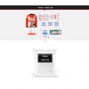 Tools and First Aid: These tools can be useful when you need help with navigation, transport, personal protection, or shelter. A  first aid kit can be used to treat minor injuries and protect against more serious health threats in a disaster.